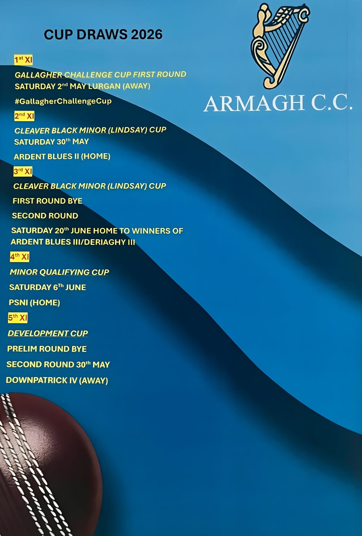 The NCU cup draws were recently made for our 5 senior teams. There’s a mix of home and away ties with the thirds and fifths receiving byes in the opening rounds of their respective competitions.